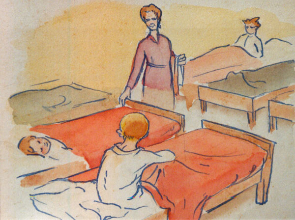 This drawing of Klaus is also published in the book "The tears under the mask" by Viviane Teitelbaum-Hirsch. It shows Madame van Liefferinge taking care of the little children in the dormitory. She is Georges’ mother and English by birth. She spoke French with a terribly English accent. Georges sent me the photographs of the drawings in 2006. He has got a good memory and he still remembers a lot about Bassines. There is a little book with all the sketches by Klaus at Bassines and that is in the Jewish Museum in Brussels. Klaus also made paintings but in a neurotic mood he has destroyed his own paintings.