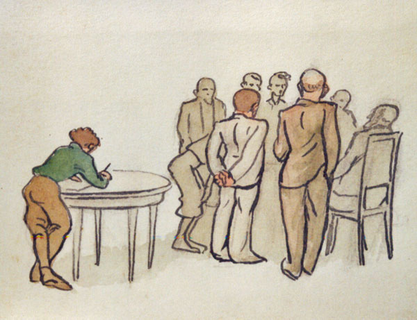Klaus made some sketches during the years he was in Bassines. This drawing shows a nice talk in the drawing room with Monsieur Cougnet sitting in the chair. Around him there are some teachers and two of his three sons.
